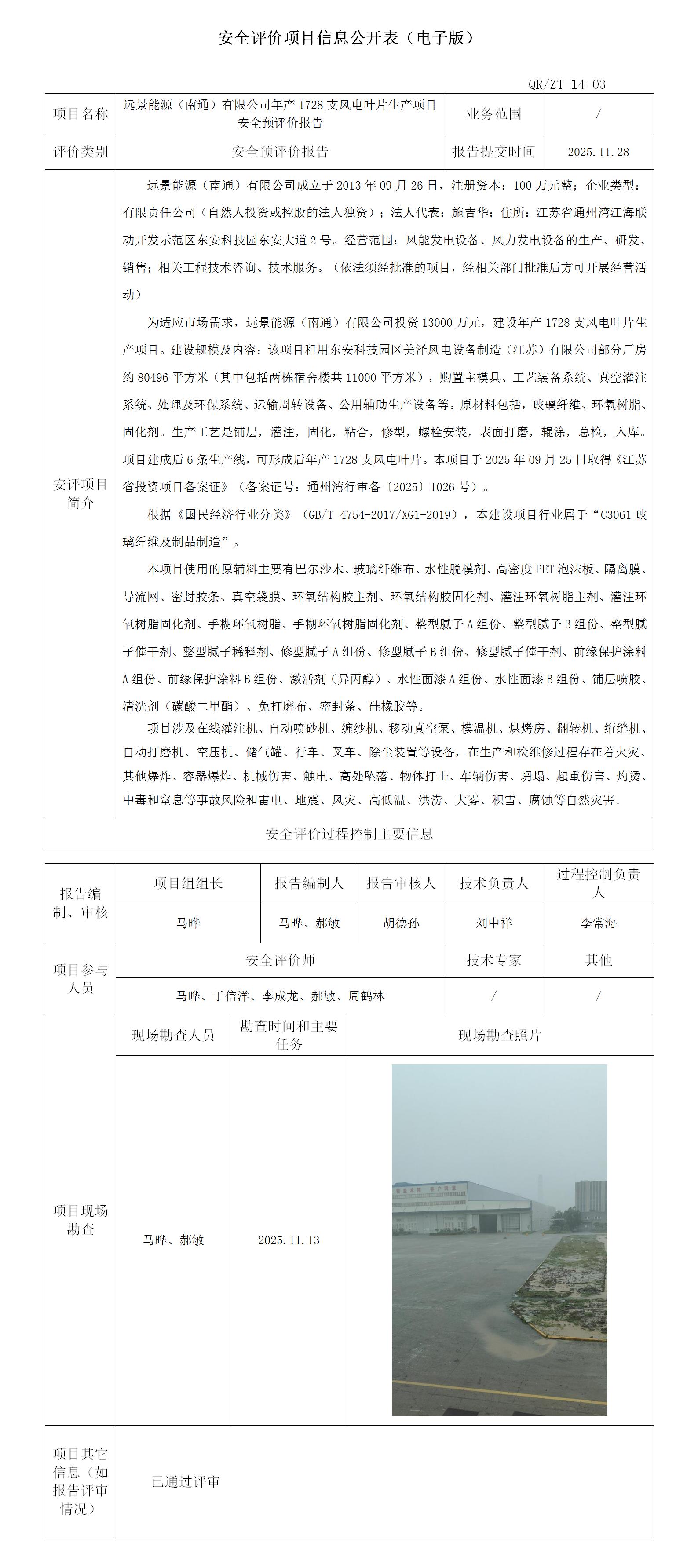 远景能源(南通)有限公司年产1728支风电叶片生产项目安全预评价报告