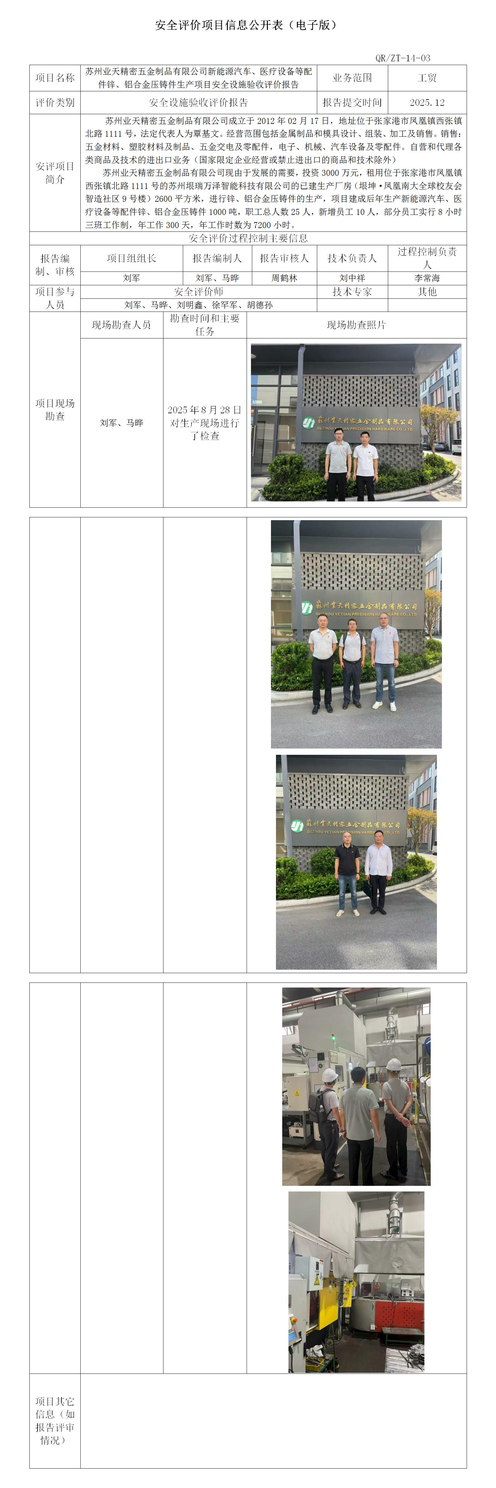 苏州业天精密五金制品有限公司新能源汽车、医疗设备等配件锌、铝合金压铸件生产项目安全设施验收评价报告