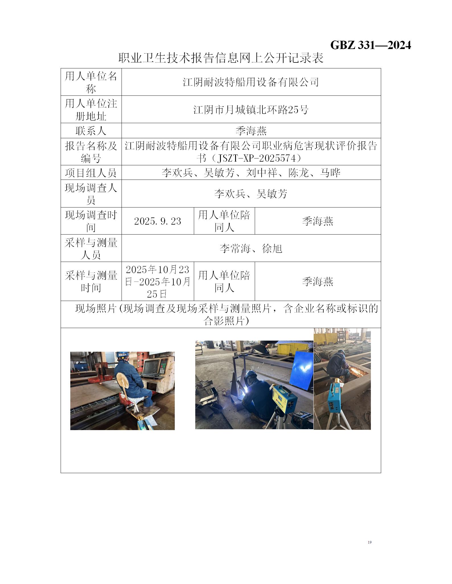 江阴耐波特船用设备有限公司职业病危害现状评价报告书
