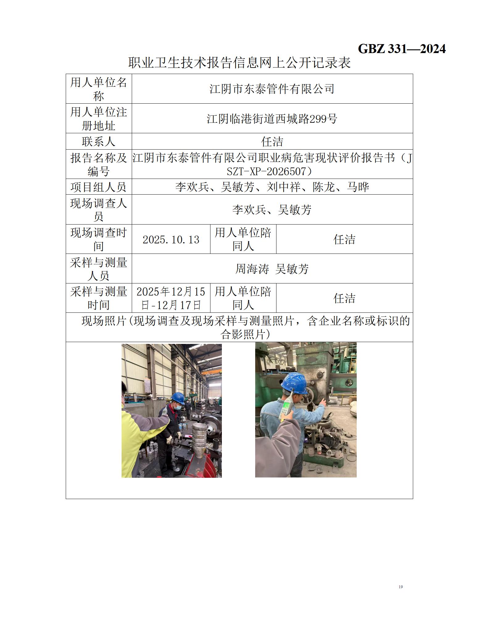 江阴市东泰管件有限公司职业病危害现状评价报告书