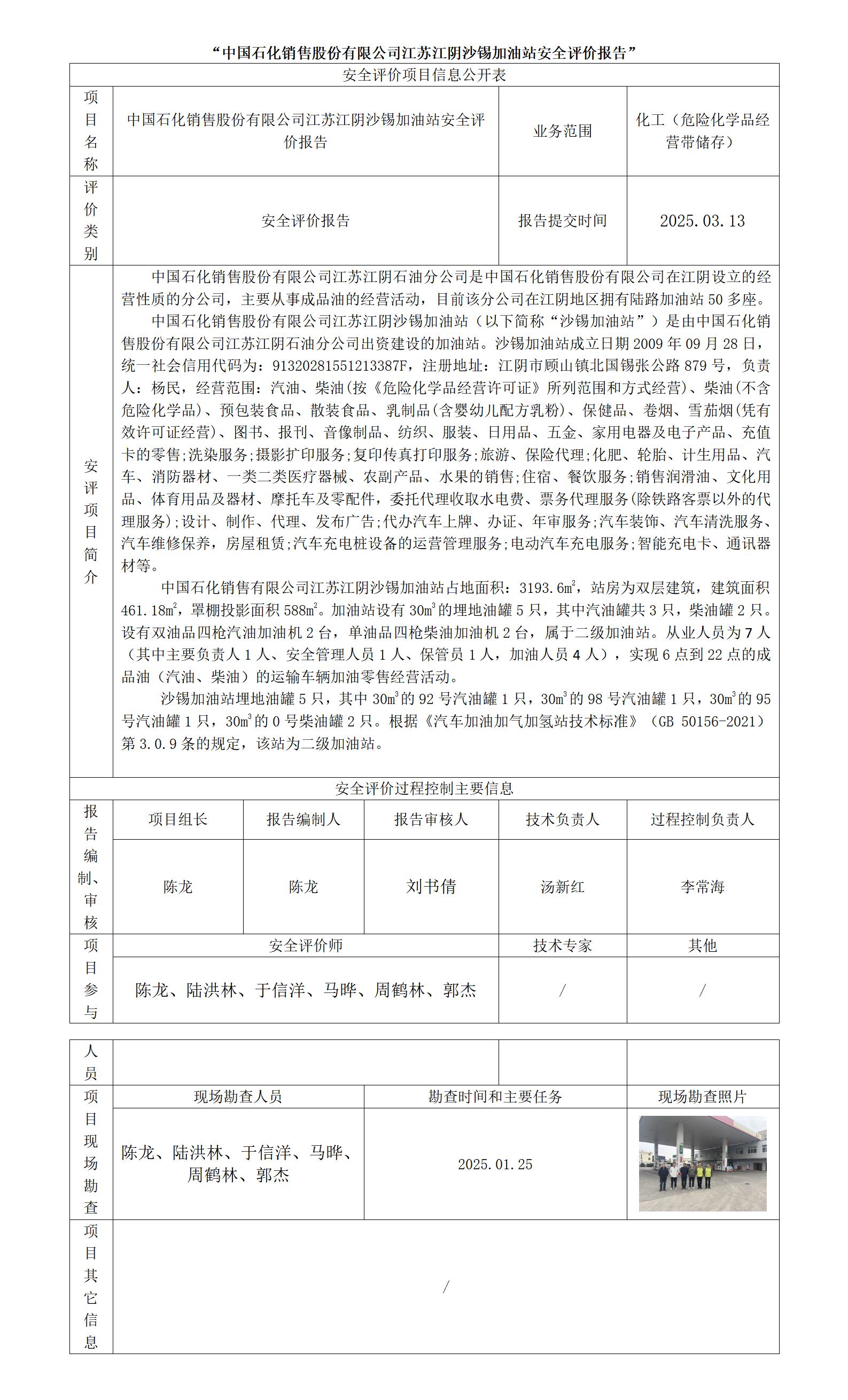 中国石化销售股份有限公司江苏江阴沙锡加油站安全评价报告