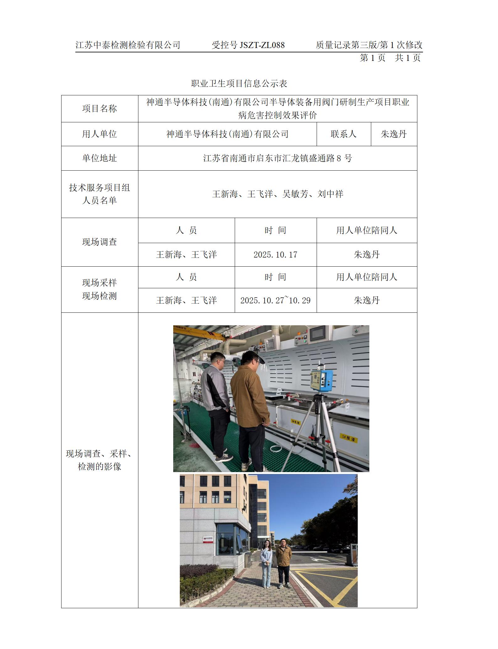神通半导体科技(南通)有限公司半导体装备用阀门研制生产项目职业病危害控制效果评价