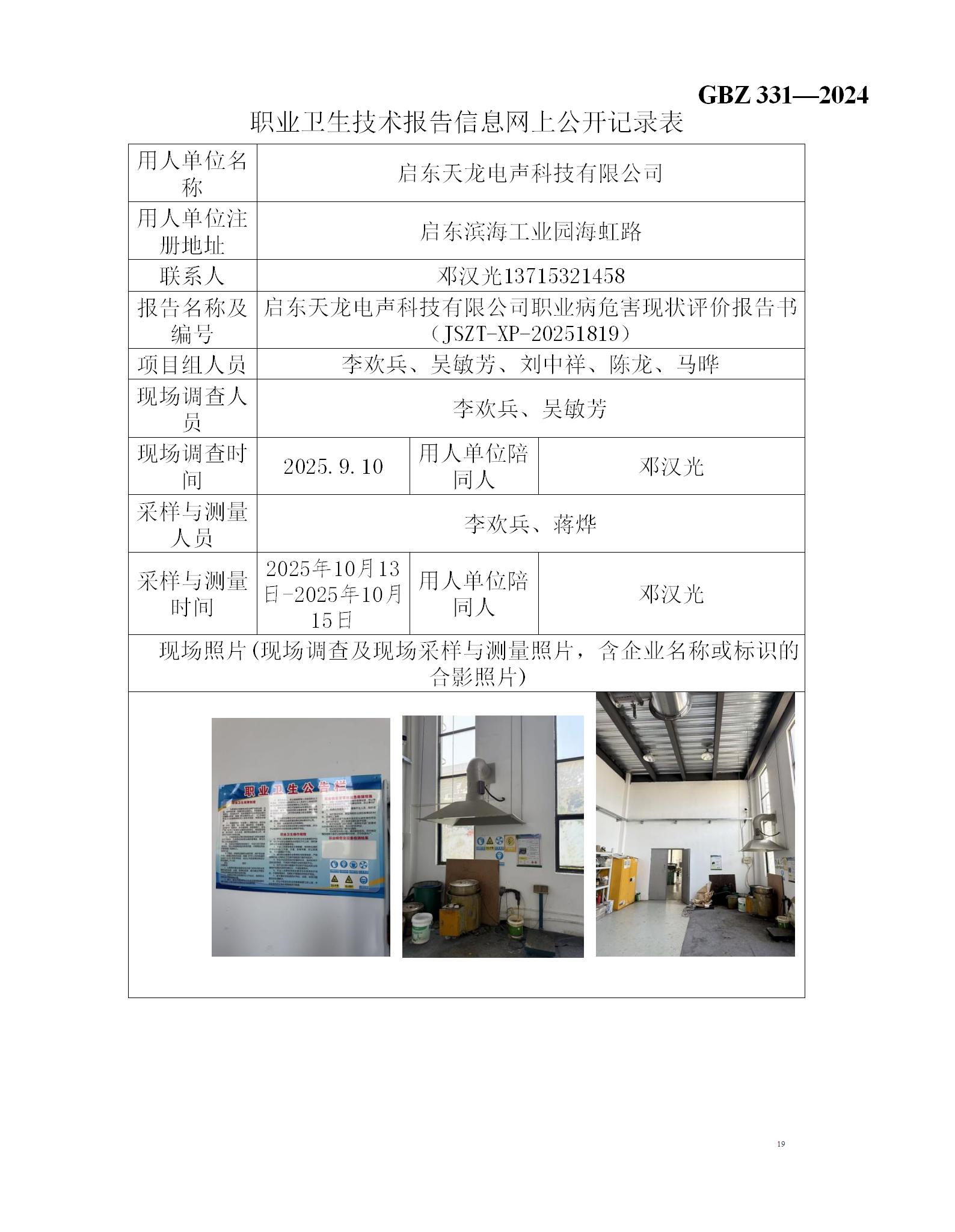 启东天龙电声科技有限公司职业病危害现状评价报告书