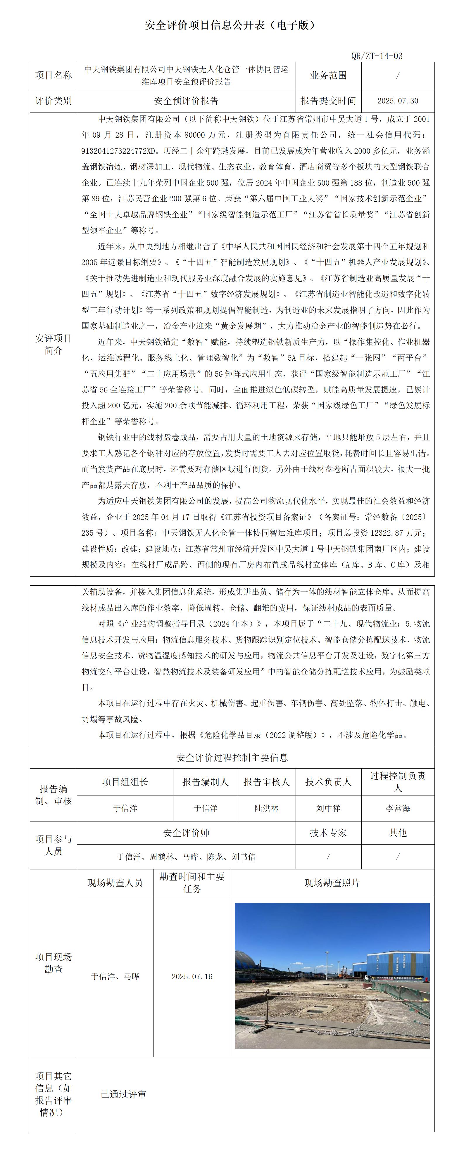 中天钢铁集团有限公司中天钢铁无人化仓管一体协同智运维库项目安全预评价报告