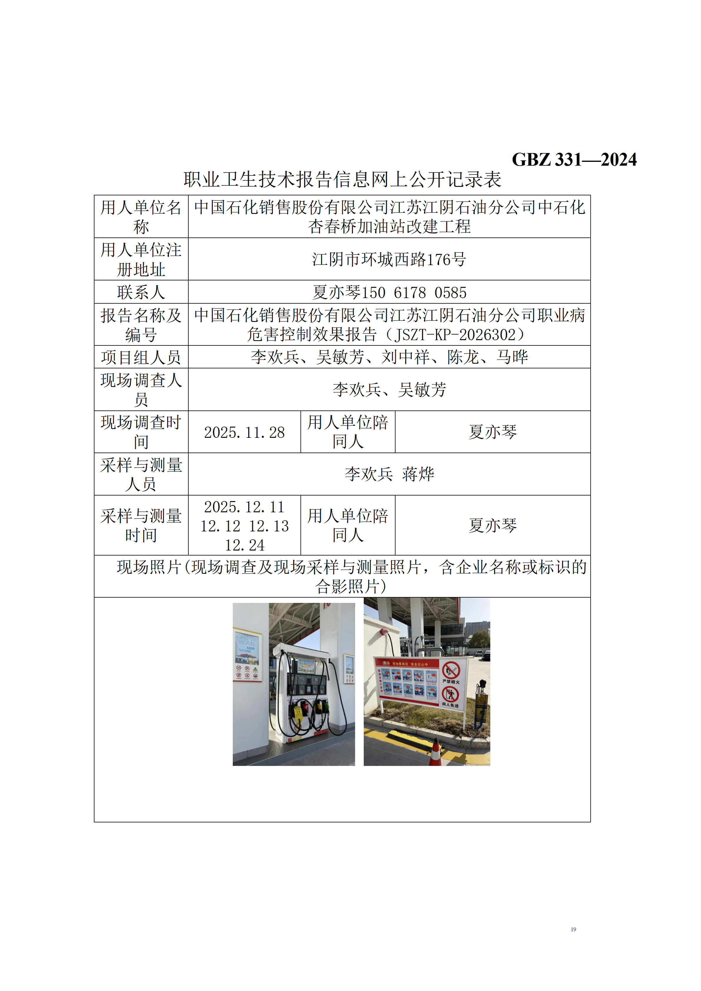 中国石化销售股份有限公司江苏江阴石油分公司职业病危害控制效果报告