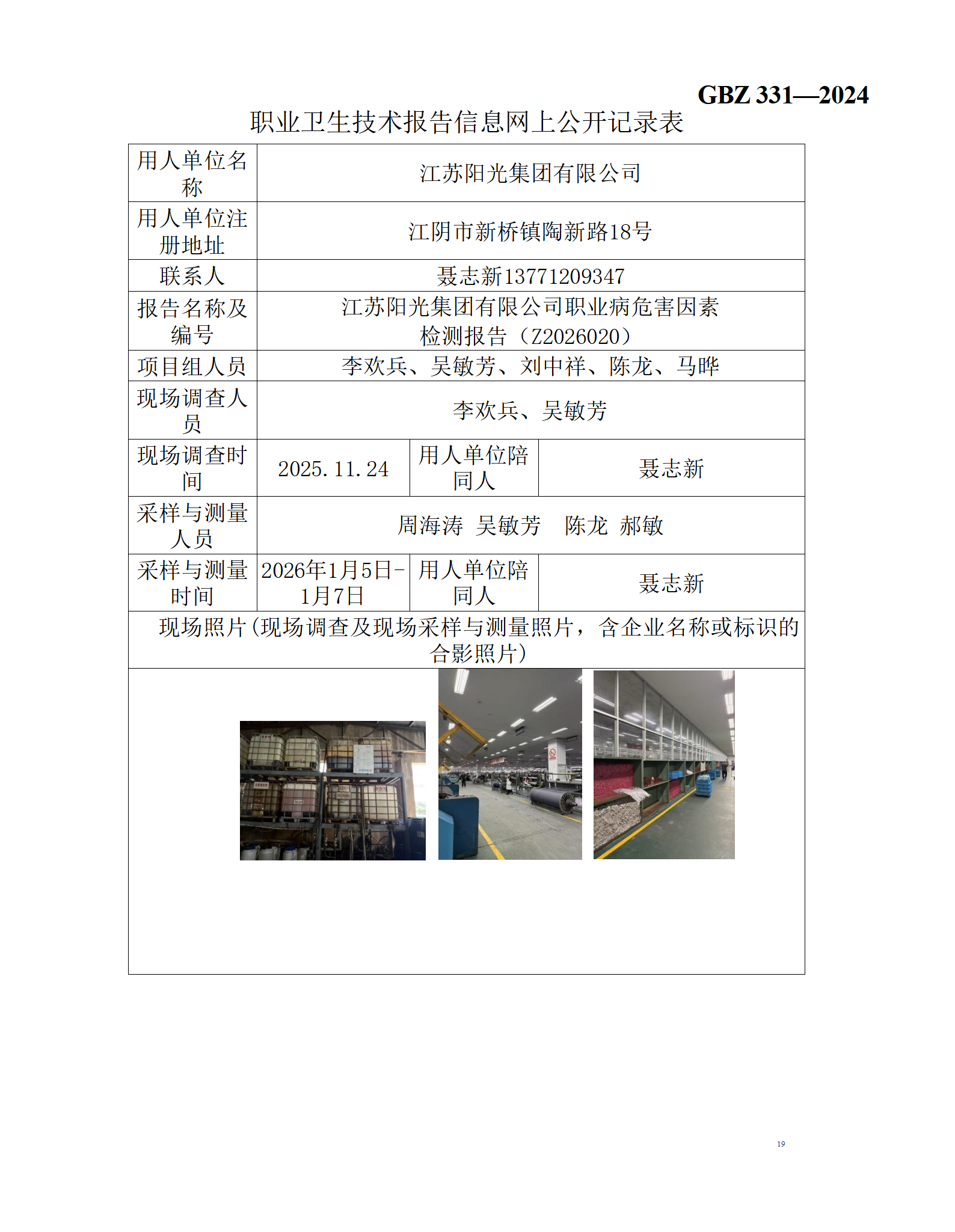 江苏阳光集团有限公司职业病危害因素 检测报告_中泰检测检验