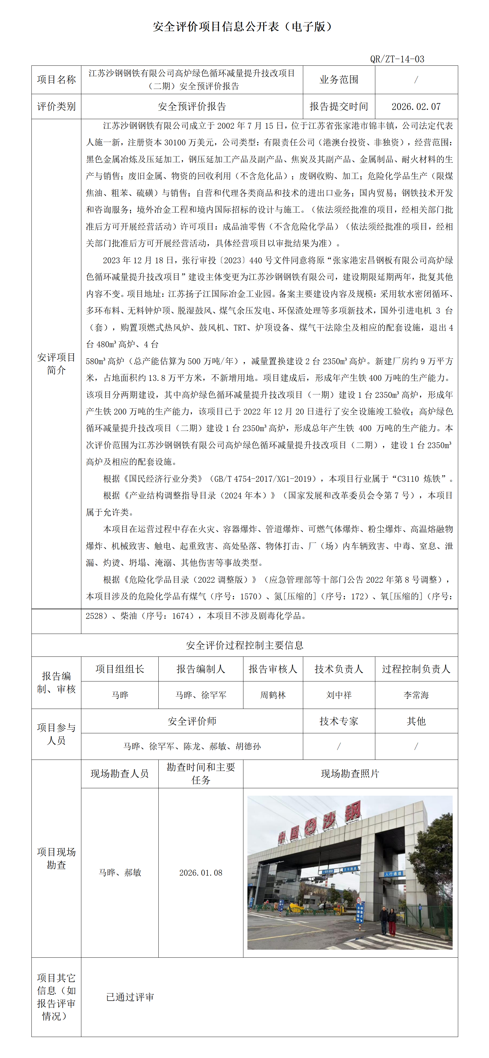 江苏沙钢钢铁有限公司高炉绿色循环减量提升技改项目(二期)安全预评价报告