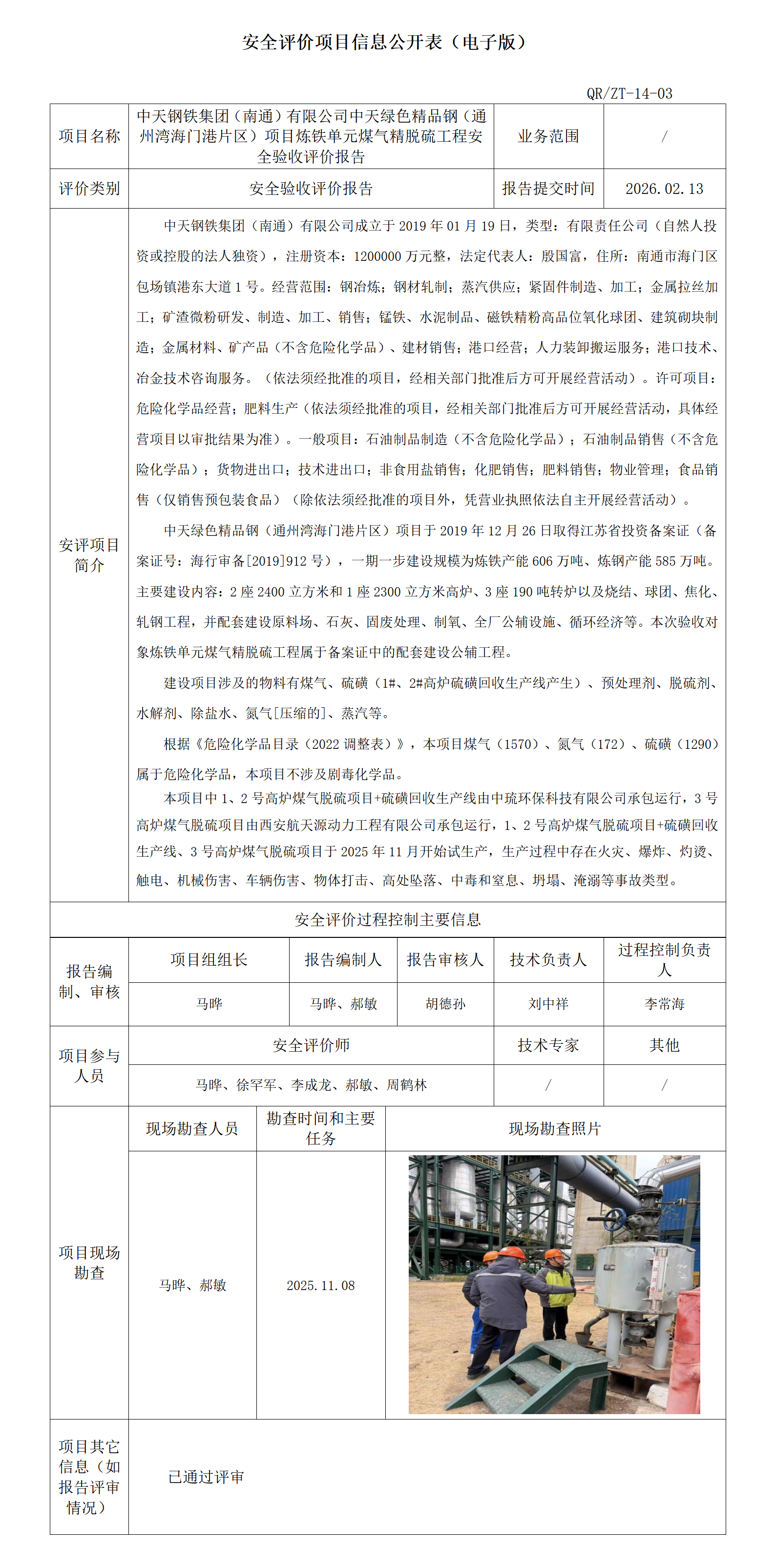 中天钢铁集团(南通)有限公司中天绿色精品钢(通州湾海门港片区)项目炼铁单元煤气精脱硫工程安全验收评价报告
