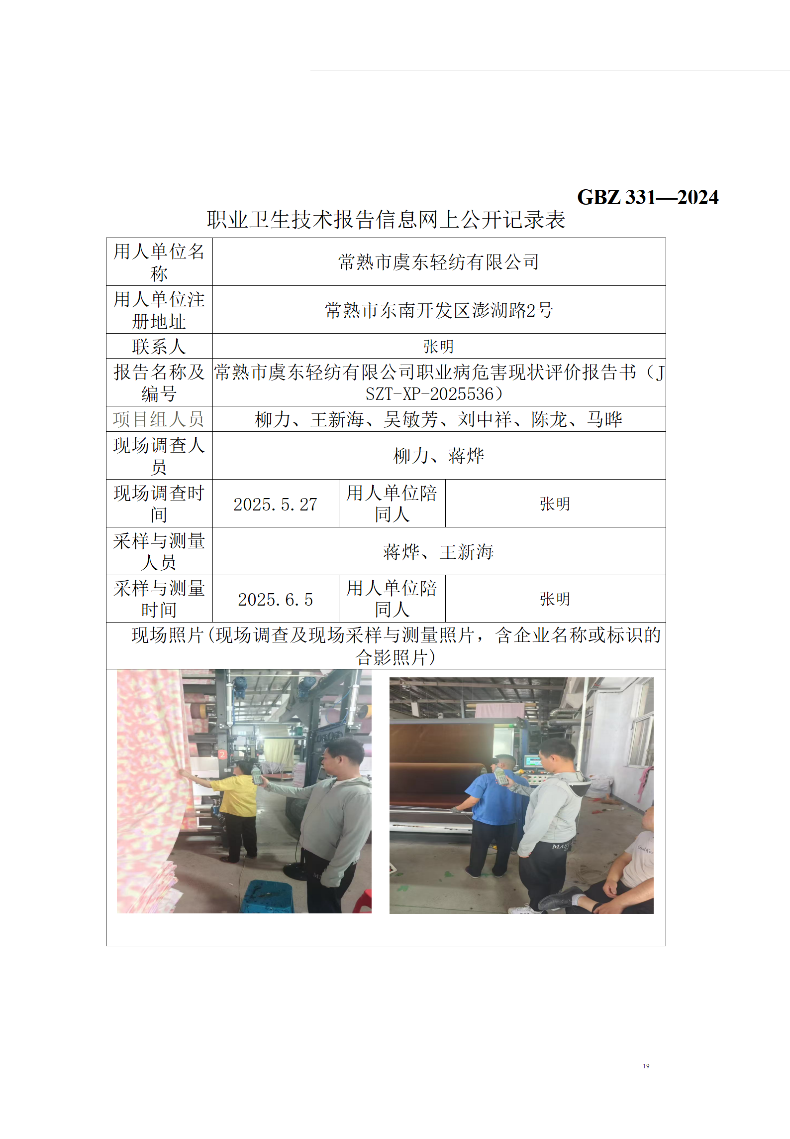 常熟市虞东轻纺有限公司职业病危害现状评价报告书